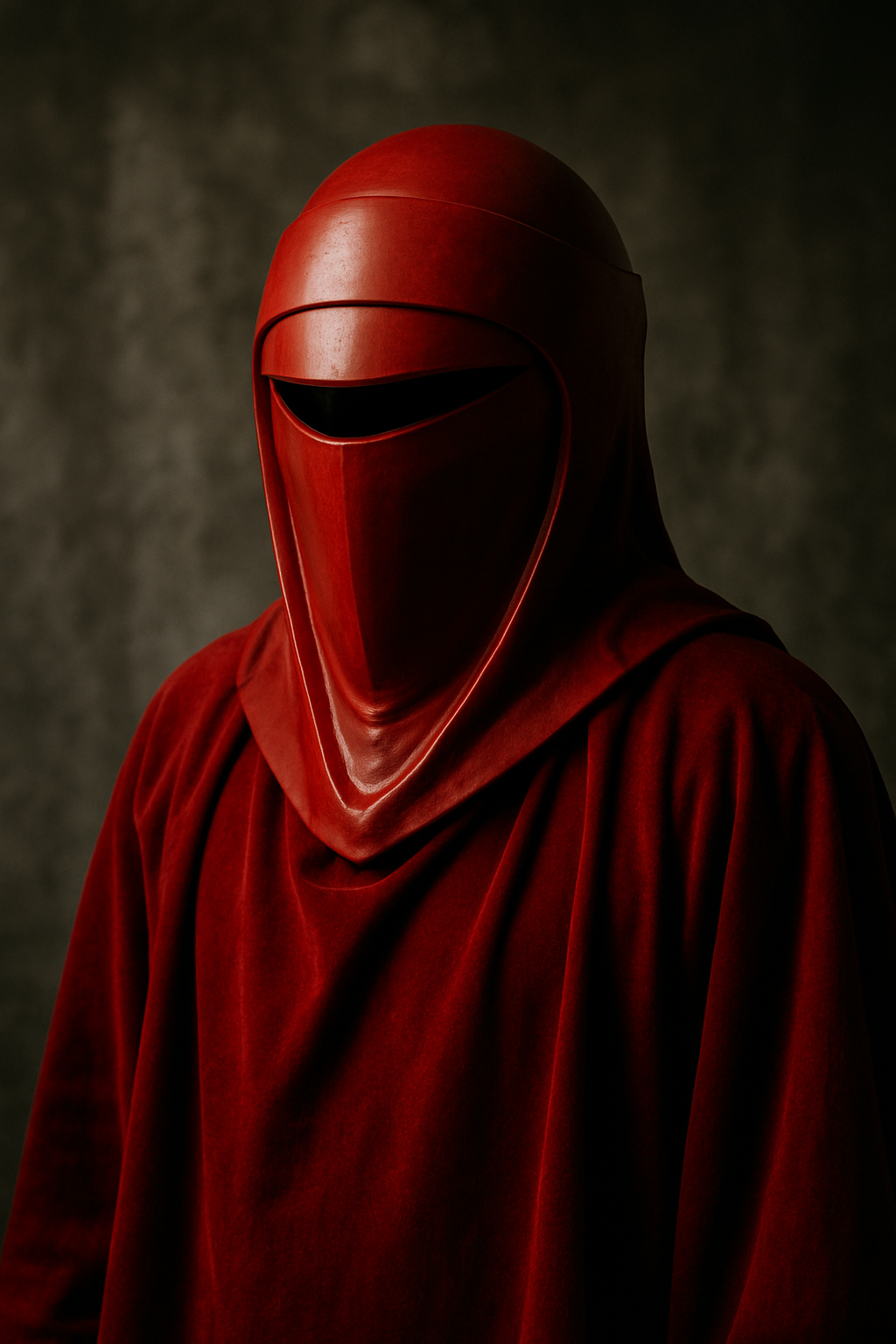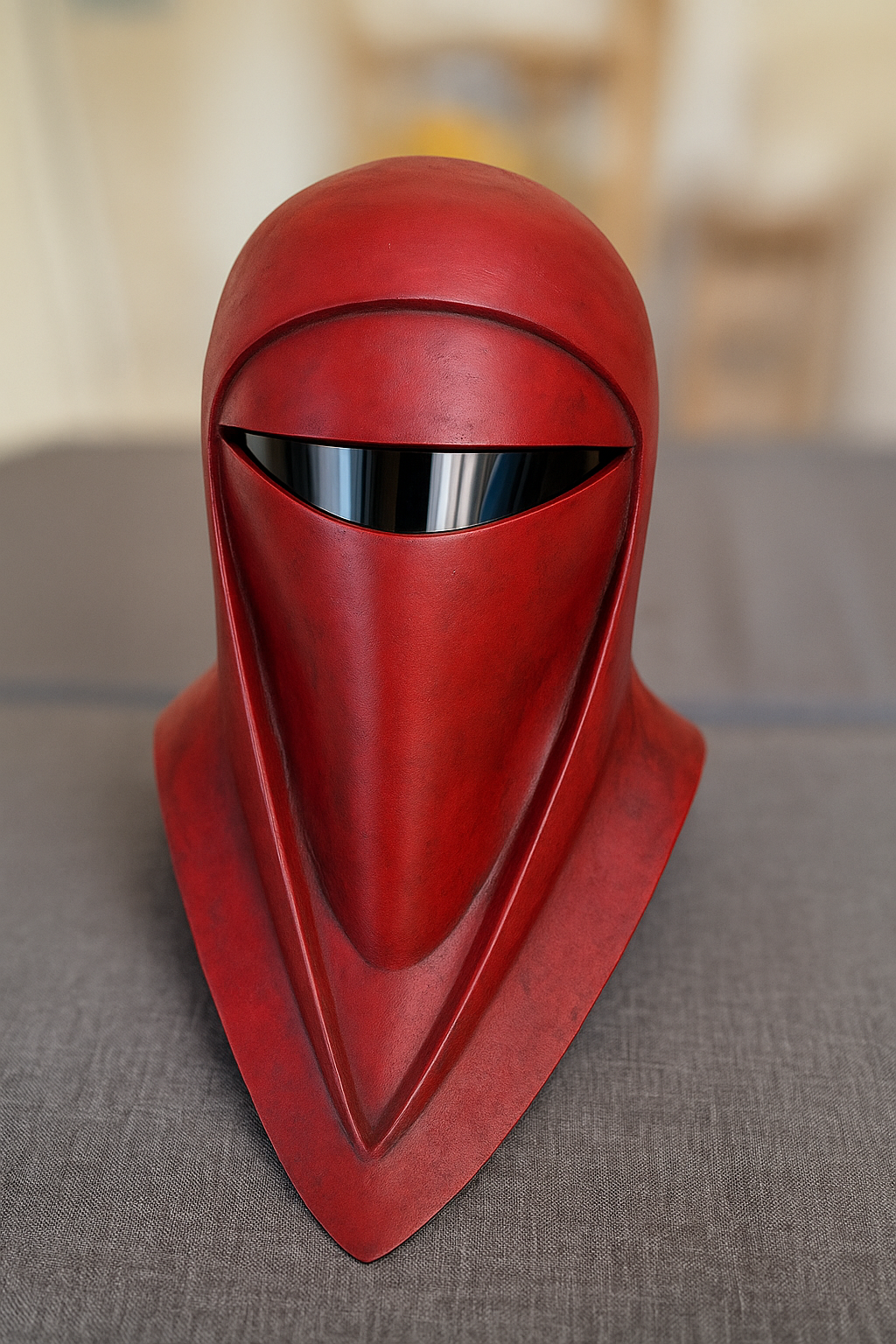 El diseño mantiene las líneas limpias y agresivas del casco original: frente alta, rostro oculto tras una abertura estrecha y una silueta afilada que cae sobre los hombros. El acabado en rojo intenso con un ligero envejecido le da volumen y evita el efecto “plástico plano” típico de las réplicas baratas.