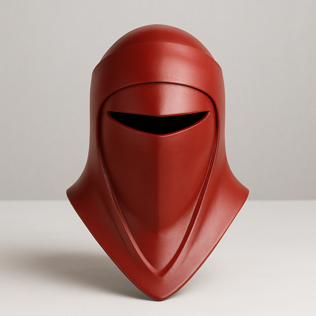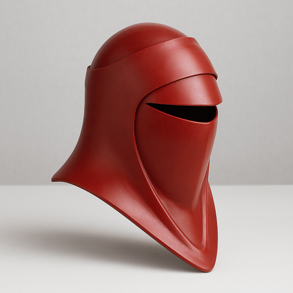 Réplica fan-made de casco de guardia real, impresa en 3D y acabada a mano, pensada para coleccionistas y cosplayers. Líneas limpias, rojo intenso y presencia suficiente como para dominar cualquier vitrina o sesión de fotos.